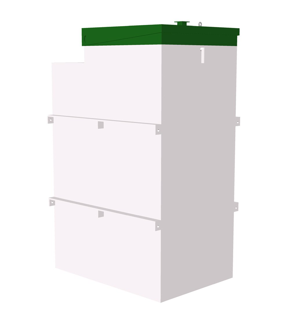 Ориентирована на ежесуточную переработку стока не превышающую 1,6 метра кубических в сутки, что эквивалентно восьми пользователям. Максимальный пиковый сброс хозяйственно-бытовых сточных вод в приемную камеру очистного сооружения рассчитан на 440 литров и будет полностью переработан ориентировочно в течение 2-х часов. Это говорит о том, что при неправильном подборе станции очистки, вода на выходе скорее всего не будет соответствовать заявленным в сопроводительных документах показателям, а так же, может иметь неприятный запах и окрашенный цвет. Септик оборудован емкостью для аккумуляции очищенной воды внутри и дренажным насосом, осуществляющим принудительный сброс по мере накопления в специальную водоотводящую канаву или дренажную систему. Канализационная труба при входе в аэрационную станцию должна залегать не глубже 85 см от уровня земли. Как и прежде на поверхности мы будем наблюдать компактную крышку зеленого цвета для контроля работоспособности и регламентных сервисных мероприятий указанных в техническом паспорте на продукцию. При принятии решения по установке данной модификации есть возможность установить ванну небольших размеров или две душевые кабины.